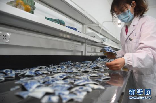 12月24日,在圆明园管理处考古工作站,工作人员对出土瓷片进行预拼接。