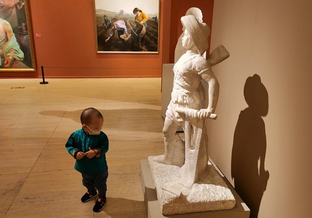 节假日是观展旺季。春节长假期间,中国美术馆网上参观预约几乎全部约满。馆里正在展出的“美在耕耘——中国美术馆2021新年大展喜迎瑞牛”当日迎来了新年的第一波观众,美术馆中人头攒动,其中有很多小观众,他们在长辈亲友的带领下,或认真参观作品、或席地临摹,美术馆中充满了学习参观的氛围。