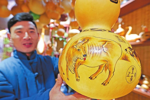 许昌市“传统葫芦烙画”代表性传承人刘小培展示烙有牛年生肖吉祥图案的葫芦牛书培摄