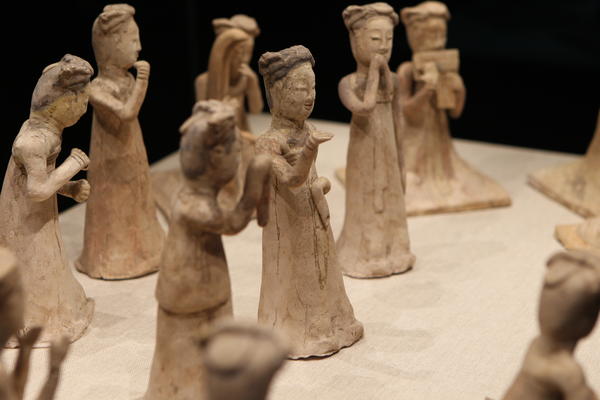 观众口中的彩绘女俑正是陈列在隋唐馆中的一组文物,包括5件绘彩陶女舞佣和8件绘彩陶坐姿伎乐女俑,在8件伎乐女俑中,其中7人分别持排箫、五弦琵琶、曲颈琵琶、筚篥、钹、笛和竖箜篌等乐器,一人击掌和乐”。在《新唐书·礼乐志》中记载,唐玄宗时,“分乐为二部,堂下立奏,谓之立部伎;堂上坐奏,谓之坐部伎。”这13件彩陶女俑都于1959年出土自安阳市张盛墓,是隋开皇十五年(公元595年)的作品,表明,唐代坐部伎在隋朝时已见雏形。