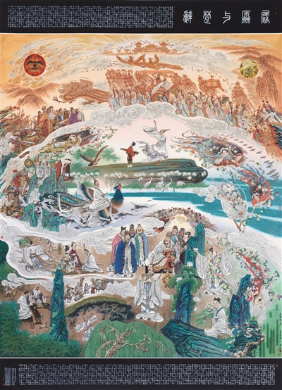 冯远中国画《屈原与楚辞》,以中国传统绘画的时空观,将历史现实中的屈原和文学作品中的屈原结合起来,着重表现屈原忧国忧民的爱国精神和高尚品质,以及《离骚》百转千回、瑰玮富丽的浪漫主义风格;吴为山雕塑《老子与〈道德经〉》,将传统写意精神融入创作,通过形体塑造,巧妙展现出老子的“虚怀若谷”……