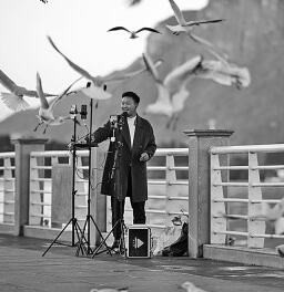 在昆明海埂大坝上,网络主播直播城市的美丽风光。新华社记者王冠森摄