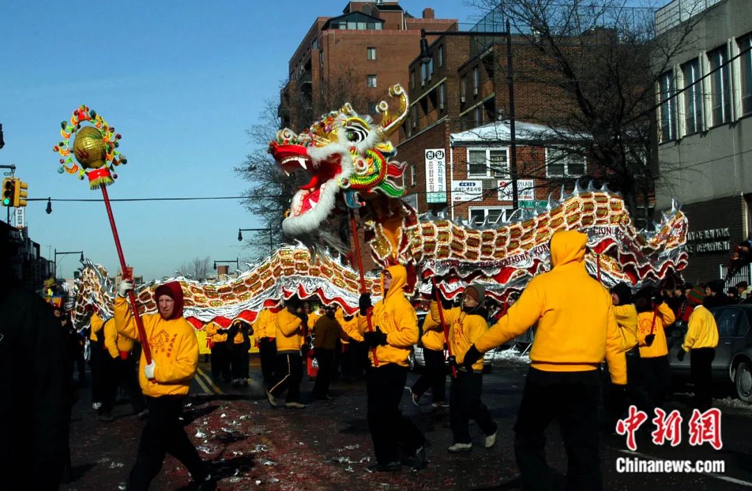 在纽约举行的新春游行的队伍中,一条巨龙飞舞迎春。赵海燕 摄