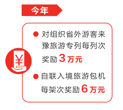 记者从会上了解到,省文化和旅游厅联合省财政厅拿出“真金白银”,对2023年旅行社组织专列、包机引客入豫给予奖励,全力推动文旅市场复苏。今年,对组织省外游客来豫旅游专列每列次奖励3万元。自联入境旅游包机每架次奖励6万元。奖励资金用于奖励组织省内外游客乘坐专列、境外游客乘坐包机到我省旅游的境内外旅行社,主要用于旅游市场开拓等宣传促销活动。