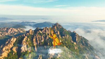 视频中,50岁的赵东升化身成孙悟空,他“腾云驾雾”从当地景区上方飞过,还与“假美猴王”斗智斗勇。