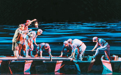 《长征第一渡》也进行了舞台科技的新探索。该剧采用罕有的360°机械液压舞台,可翻转可升降,结合声、光、电等高科技手段,模拟再现雪山、草地等历史场景,为观众营造沉浸式的观演体验。尤其值得一提的是,为了真实再现红军长征岁月的艰苦卓绝,该剧还将大型瀑布、铁索桥等搬上舞台,最大化地丰富了舞台空间。大跨度威亚、可开合大屏等也增强了视觉张力,带给观众强烈的感官冲击。