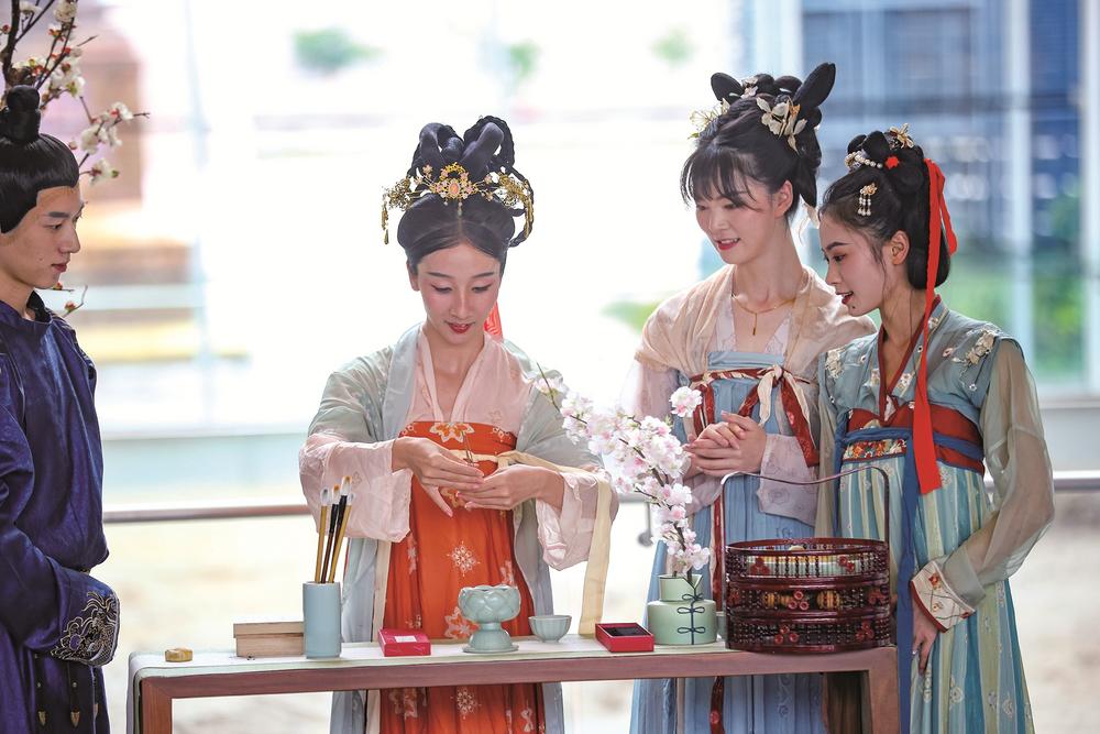 七夕节是国家级非遗代表性项目。8月22日是今年七夕节,南京大报恩寺遗址博物馆开展了多项活动,生动还原古人七夕乞巧的习俗,吸引游客参观体验。图为当日,身着古装的演员以古礼再现传统文化之美。