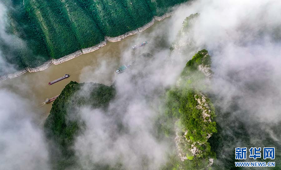 从高处俯瞰,两岸青山连绵,船只行于江面。新华网发(朱云平 摄)