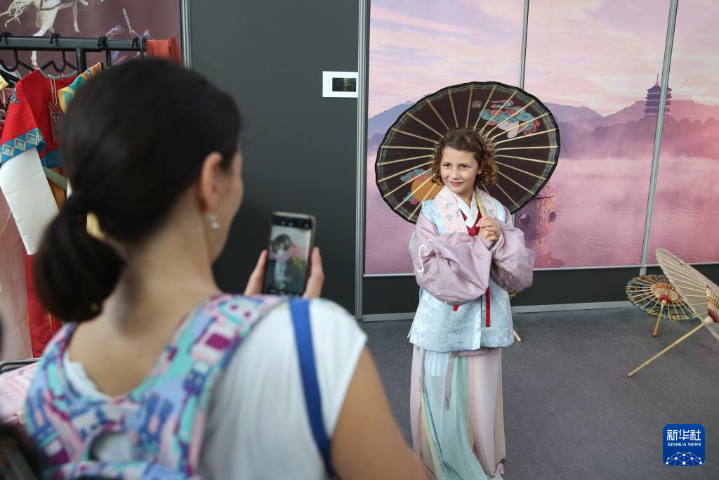 9月8日,在比利时布鲁塞尔漫画节中国馆展区,小朋友身着汉服拍照。