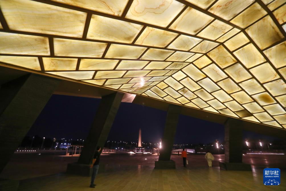 这是10月8日在埃及吉萨省拍摄的晚上亮灯的大埃及博物馆大厅。