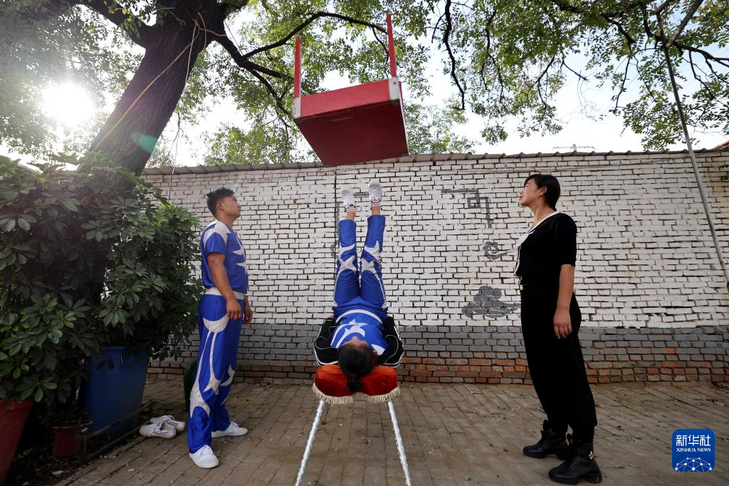 10月18日,杂技学员在河北省沧州市吴桥县于集镇东街一特色杂技小院练习杂技。