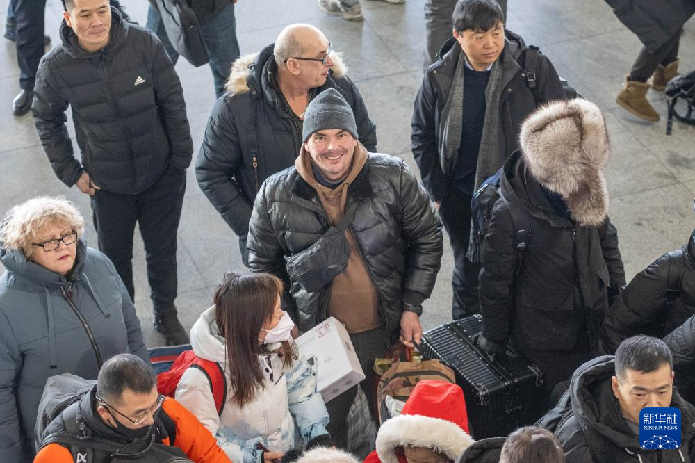 1月30日,中外游客在黑河水运口岸出境大厅等候进入出境通道。新华社记者 谢剑飞 摄