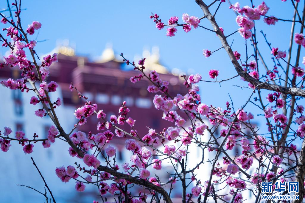 3月15日,杏花映衬下的布达拉宫。新华网 旦增努布 摄