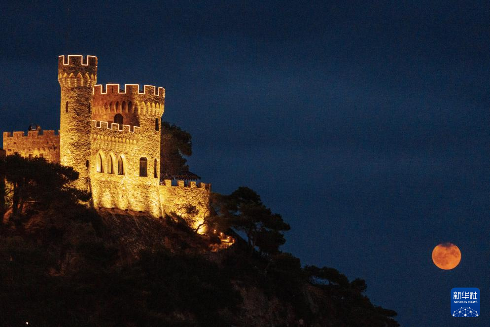 这是8月19日晚拍摄的西班牙巴塞罗那附近海边城堡和月亮。
