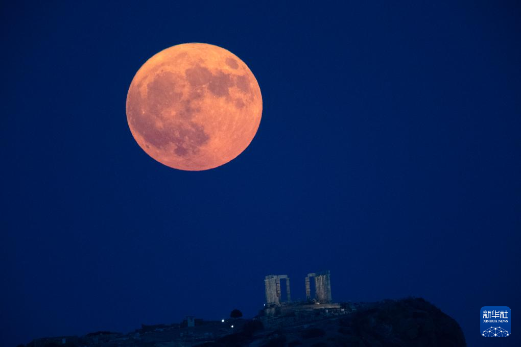 这是8月19日在希腊雅典附近苏尼翁角拍摄的波塞冬神庙上空的月亮。