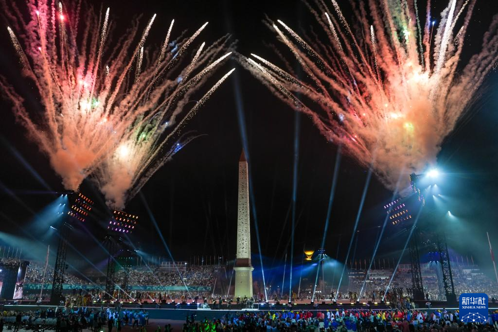 这是8月28日在巴黎协和广场拍摄的开幕式现场的焰火表演。