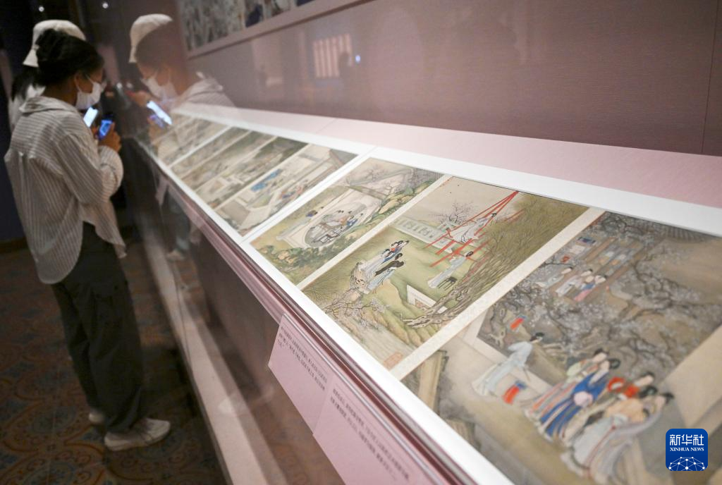 9月4日,参观者在北京故宫博物院观看月曼清游图册。