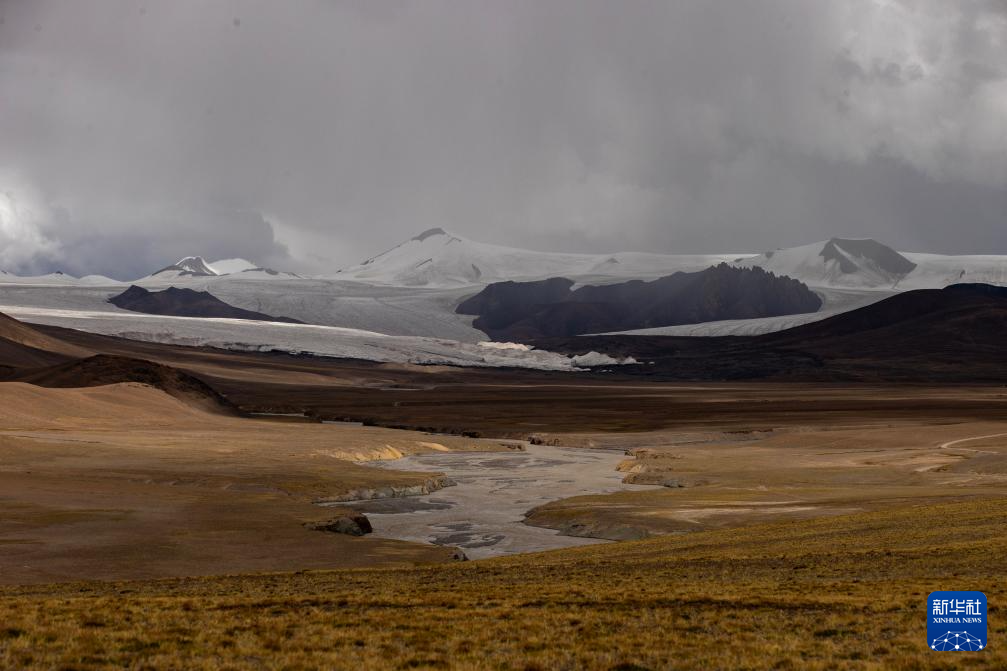 这是9月4日拍摄的普若岗日冰原8号冰川、消融形成的径流以及远处的令戈错(无人机拼接照片)。新华社记者 姜帆 摄