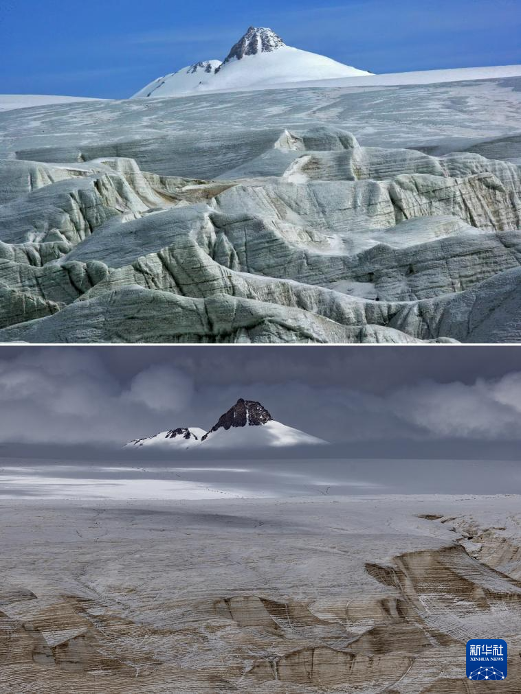 拼版照片:上图为2009年6月拍摄的普若岗日主峰(新华社发 车刚摄);下图为2024年9月4日拍摄的普若岗日主峰(新华社记者姜帆摄)。对比可以看出普若岗日主峰下的冰原消融严重。新华社发