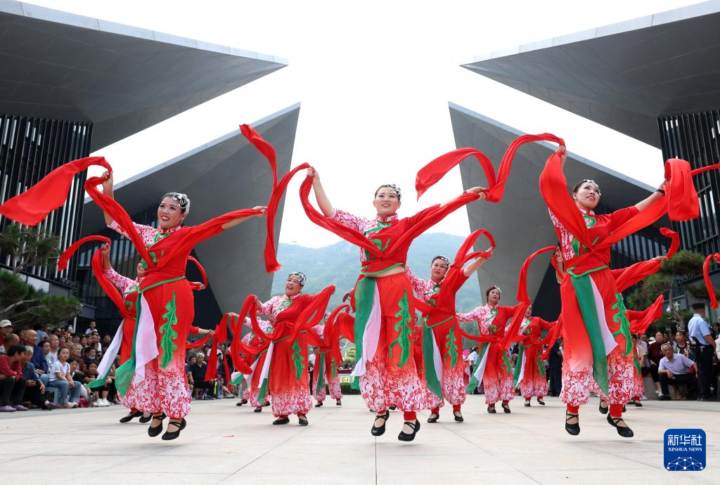 9月17日,在河北省石家庄市平山县光禄山风景区,当地群众为游客表演秧歌。