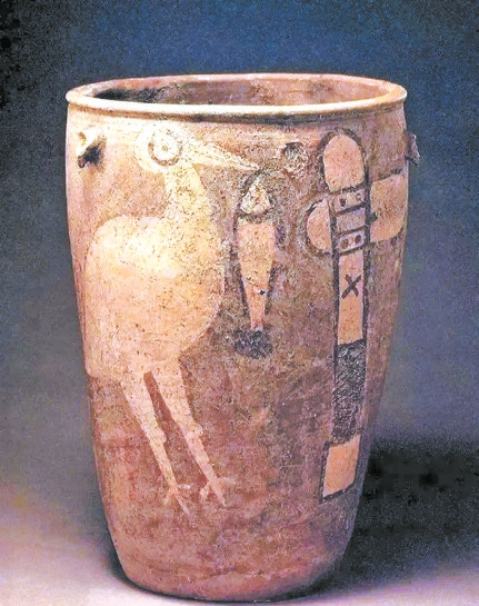 彩绘陶缸的主要图案是一只水鸟、一条鱼、一柄石斧,一般被称为“鹳鱼石斧图”,这是截至目前中国新石器时代发现的画幅最大、内容最完整丰富的彩绘陶画,称其为“中国绘画的鼻祖”也不为过。