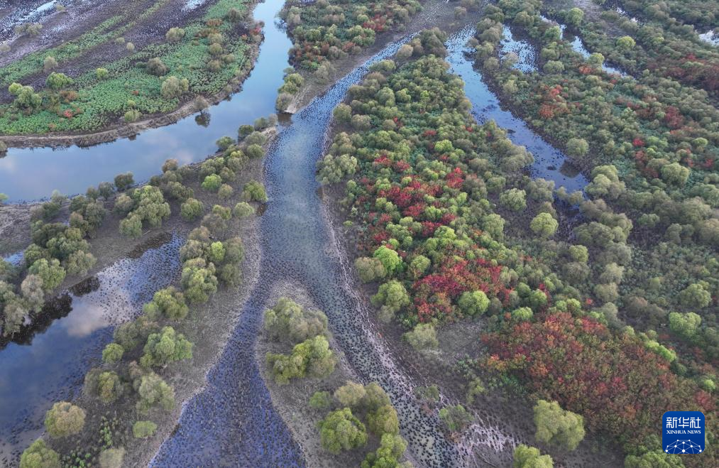 9月24日拍摄的黑龙江省双鸭山市饶河县乌苏里江畔的湿地秋色(无人机照片)。