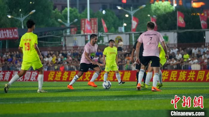 中新社贵州榕江9月29日电 (记者 袁超)“发现中国之美·相约贵州村超”国际友谊赛28日晚在贵州“村超”发源地榕江县举行。拉美和加勒比国家驻华外交官联队与榕江本地村民组成的“村超”罗汉果队展开了足球交流。