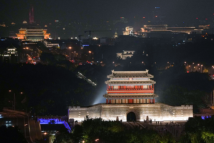 图为9月26日拍摄的完成景观照明设施提升后亮灯的永定门城楼和中轴线上的建筑。新华社记者 鞠焕宗 摄