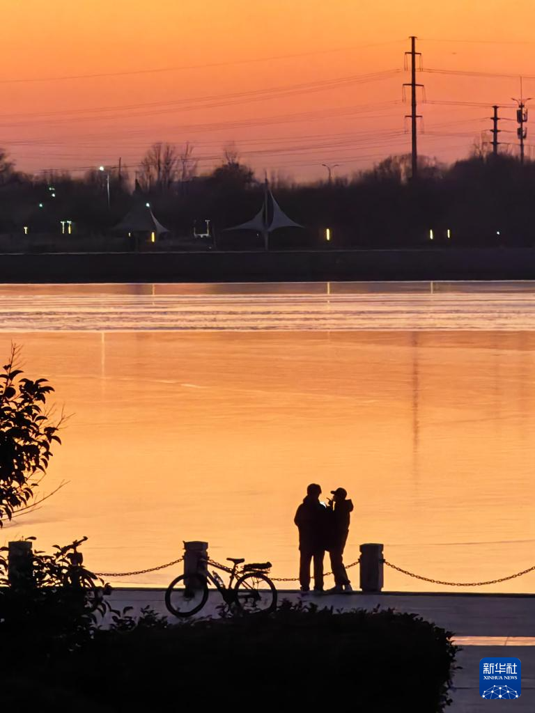 12月28日,一对情侣在山东省聊城市茌平区金牛湖国家湿地公园欣赏晚霞。