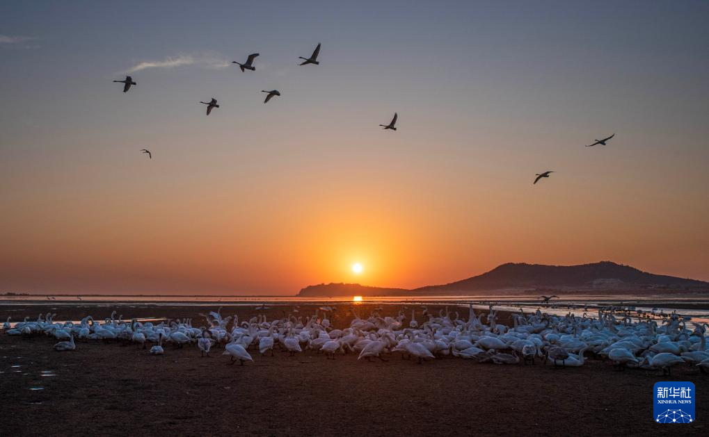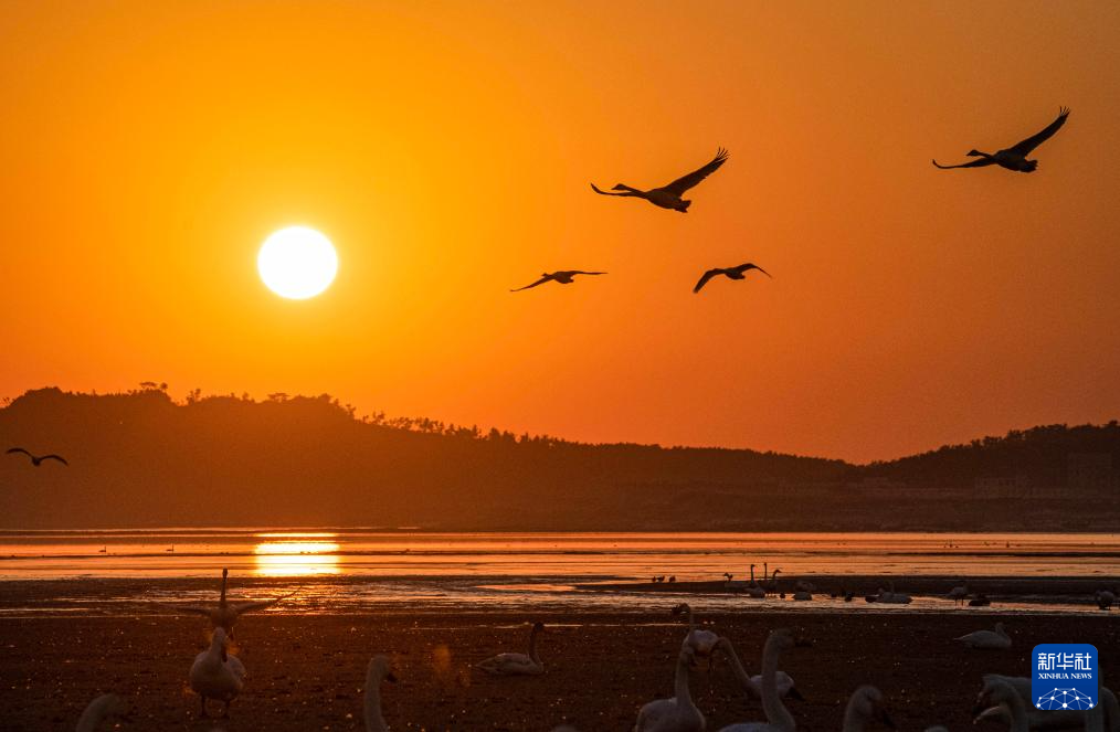 12月29日,在山东省荣成大天鹅国家级自然保护区天鹅湖湿地,大天鹅在晨光中休憩、飞舞。