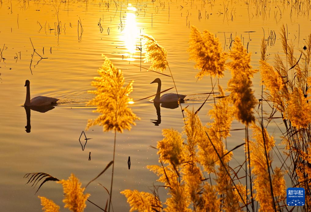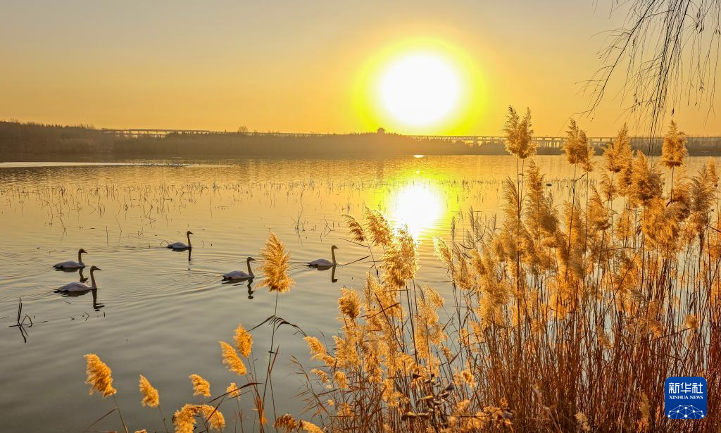 12月28日,在河南省三门峡市天鹅湖国家城市湿地公园,几只天鹅在夕阳余晖下游动。