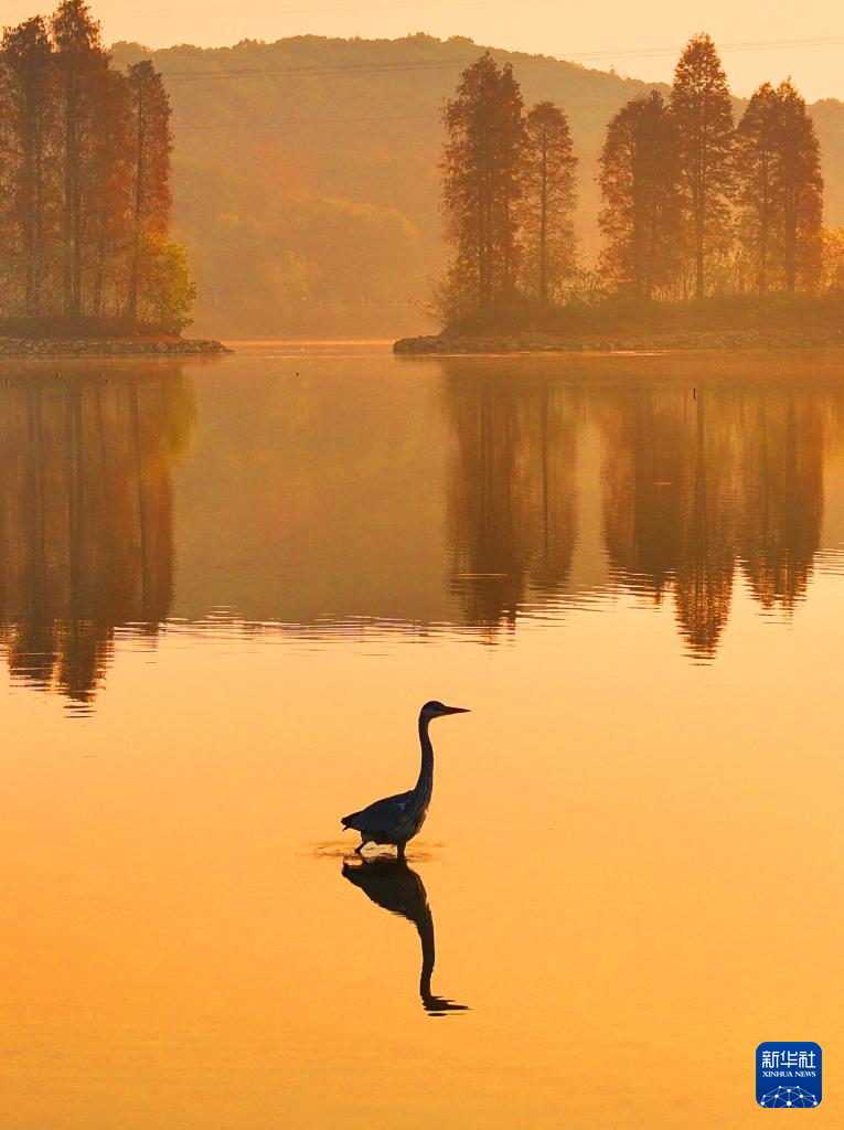 12月29日清晨,白鹭在湖南省衡阳市雁峰区南湖公园的湖面上栖息(无人机照片)。