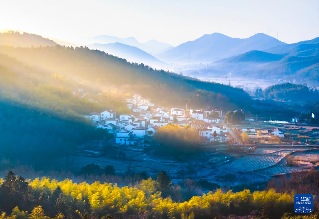 12月29日在安徽省芜湖市繁昌区峨山镇城东村拍摄的乡村晨景(无人机照片)。