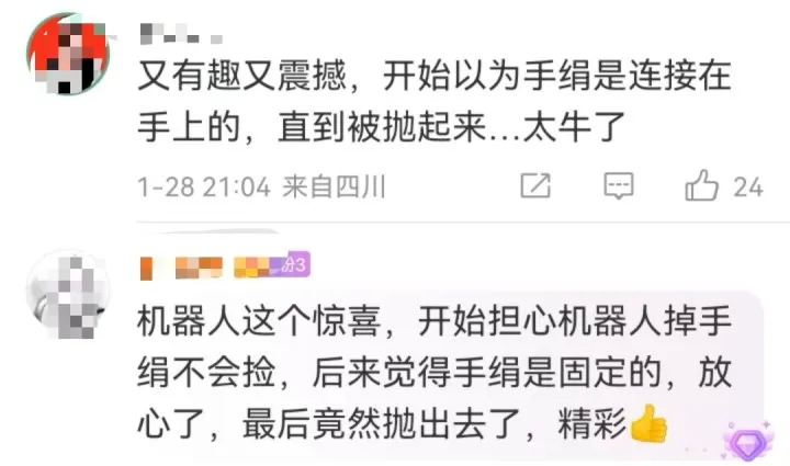 有网友问,机器人飞手绢真没想到,太震撼了,是不是绑了绳子?