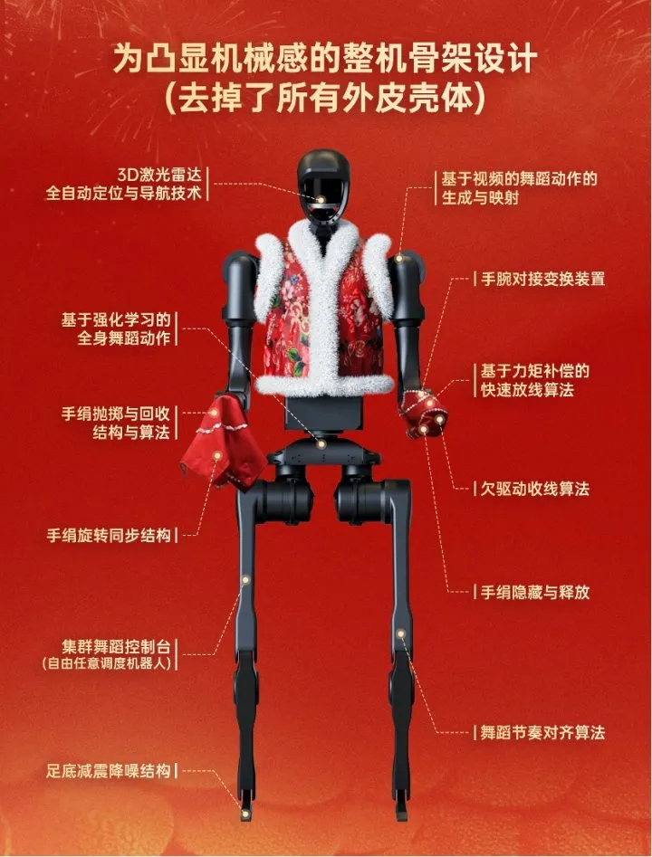 大家可能觉得机器人的形象很机械呆板(只有骨架,去掉皮肤),这其实是为了与舞蹈艺术真人产生更多反差,而特别设计的。这种反差不仅不会让机器人的表演显得突兀,反而让整个表演更加生动有趣,令人眼前一亮。