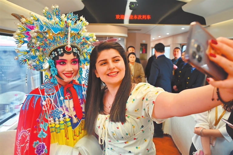 在“中原铁道·大河之南号”特色旅游列车上,国外旅客沉浸式感受河南特色文化。 祁映辰 曹源 摄