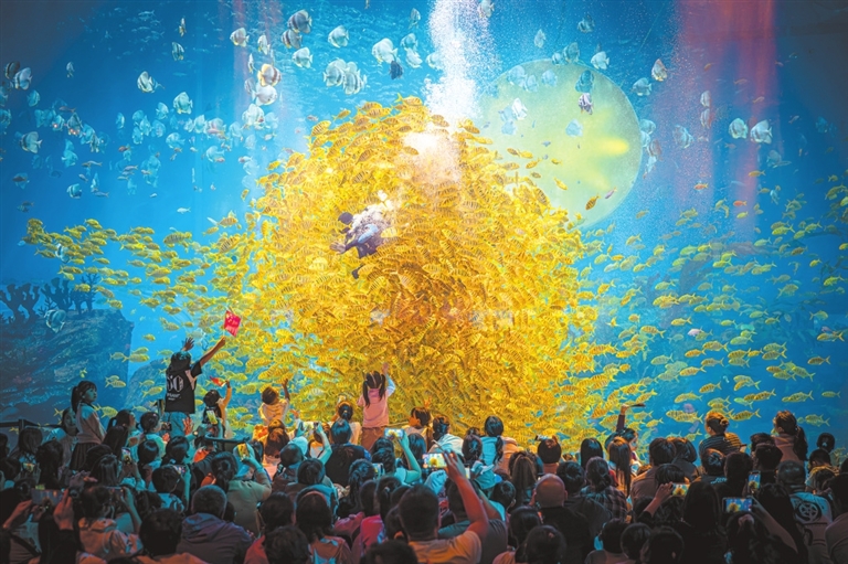 郑州海昌海洋公园的海底世界,潜水员和一群鱼儿游过。崔光华 摄