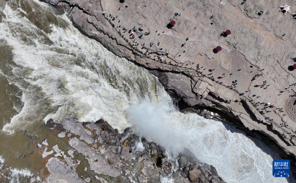 夏日时节,在位于晋陕交界处的黄河壶口瀑布景区,气势磅礴的黄河水如万马奔腾,壮美景观吸引游人驻足游览。