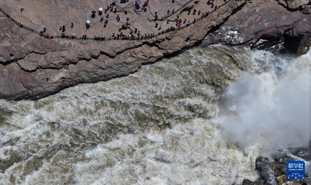 6月4日,游客在位于晋陕交界处的黄河壶口瀑布景区参观(无人机照片)。