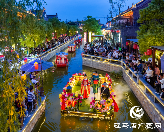 夜色渐浓,好戏轮番登场。《英台小姐姐》花船凌波,演员踏歌起舞,裙摆与灯影在水面共舞;《明宫月乐》的水袖翻飞如流云,与月亮球舞台的璀璨灯火交相辉映;《舞艺杂坛》的鼓点敲热了街巷,彩衣舞者旋转间,带起满巷光影。一场场演出,让夜色有了故事,让古驿有了灵魂。