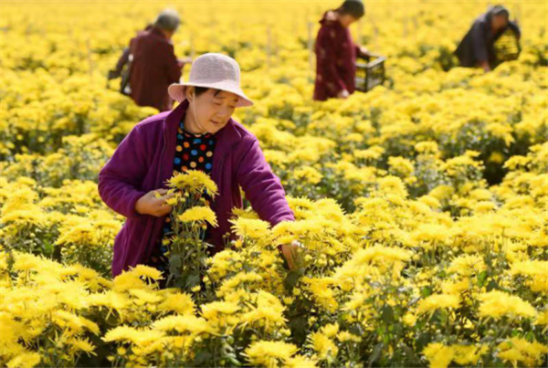 站在菊花地里,放眼一望无际的花海,段飞介绍说:“你看,像这些种植的观赏菊,在市场上可以卖到每盆30元。金丝皇菊是一种名贵的中药材,具有疏风散热、养肝明目、清凉解毒等功效。用金丝皇菊作原料制作的菊花茶,清远香醇,汤色明艳,既有观赏价值,又有药用功能,被誉为茶中之佳品,我们的种植基地现在每亩可以产花茶150多斤,每斤可以卖到70元,市场仍然供不应求、‘钱’途光明。现在我们带动了60余户贫困户进行菊花种植,由公司免费提供技术指导和幼苗,每户贫困户保底收入2000元/亩,平时采摘和培育菊花幼苗的时候,我们也会雇佣大量贫困户,给他们发工资,争取带动大家一起脱贫致富。以后我们还打算注册自己的菊花茶品牌,到时候每亩的菊花产值就会实现翻几番。”