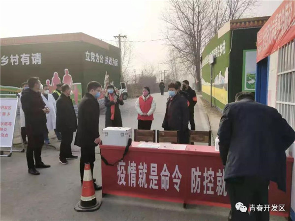 团开发区委书记带领工作人员到分包的19个小区,逐小区、逐栋张贴告知书、悬挂宣传横幅、逐户逐人排查登记。积极配合社区严格落实到岗到位制度、日报零报制度,发现疑似情况第一时间报告。