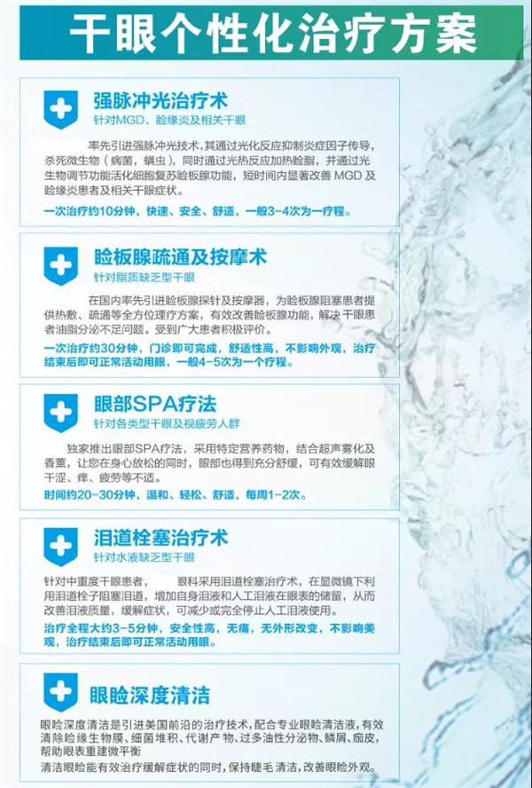 多重方法科学结合的综合精准化治疗让您在身心放松的同时眼部也得到充分舒缓有效缓解眼干涩、痒、疲劳等不适受到广大眼干涩、眼疲劳、睑板腺问题患者的欢迎。