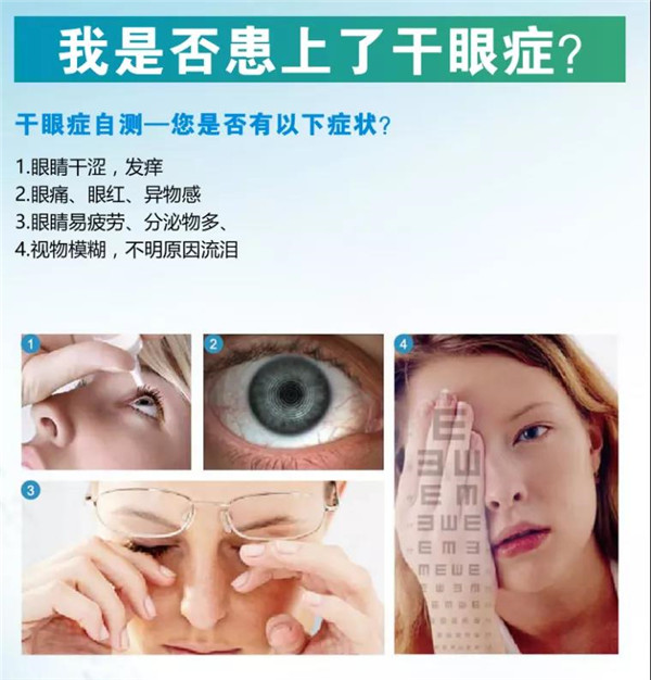 主要症状为眼干涩、烧灼感、异物感、针刺感、眼痒、畏光、眼红,严重的还会引起视物模糊、眼胀眼痛等;