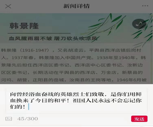 本次活动主题为我们的节日•清明:向天中英烈致敬。截至目前,金河办事处一百余名干部职工通过“今日驻马店”、“咱的驻马店”客户端及登录“驻马店文明网”的方式,上网祭奠英烈,观看天中英烈事迹,网上献花,寄语留言,表达心声,增强爱党爱国意识,激发爱党爱国情感。祭祀者在网上认真地浏览着每一位天中英烈的事迹,认真地填写自己的信息,用心写下自己的寄语。
