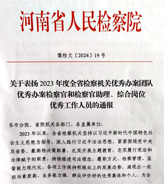 近日,河南省人民检察院印发《关于表扬2023年度全省检察机关优秀办案团队、优秀办案检察官和检察官助理、综合岗位优秀工作人员的通报》(豫检文〔2024〕19号),上蔡县人民检察院第五检察部干警张丽杰被评为“优秀办案检察官助理”。