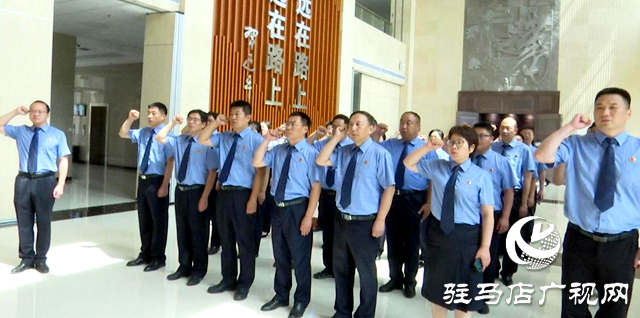 参观结束后,党员干警一起高举右手,面对鲜红的党旗,重温入党誓词。