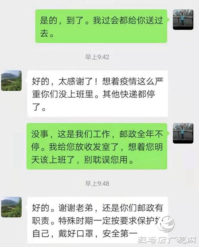 客户通过微信信息,由衷感赞“还是你们邮政有职责担当”,并叮嘱孙萌带好口罩,做好防护措施。孙萌把聊天记录给同事传看后,大家纷纷表示,辛勤付出能得到客户认可,是全体揽投员做好邮政投递服务的不竭动力。