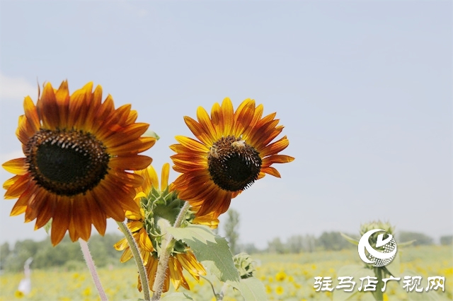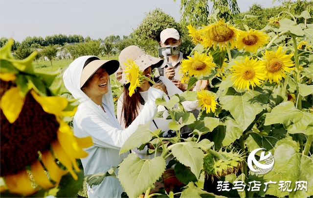 7月17日,记者在驻马店市驿城区西郊看到,这里的10万多株向日葵竞相盛开,金灿灿的花海与周边的景色相映生辉,构成一幅五彩斑斓的美丽画卷,吸引了许多游客前来拍照打卡。(记者 张天 通讯员 米山)