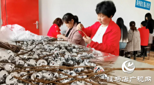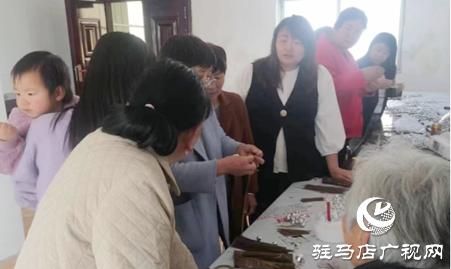4月17日,在驻马店市驿城区古城街道洪沟庙社区,一些女工正在制做小铃铛、装饰花等饰品,大家十指翻飞,忙碌不停。